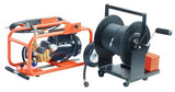 A removable 150 ft. capacity hose reel with reel brake and swivel is mounted on a heavy duty frame with two 8” semi-pneumatic tires. Complete with JN-0 & JN-10 nozzle sets & tool box.
